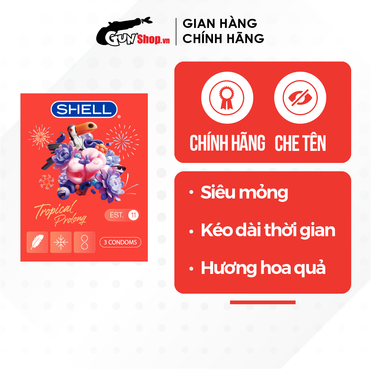 Thông tin : Bao cao su Shell Tropical Prolong với hương hoa quả nhiệt đới chắc hẳn sẽ đem lại trải nghiệm tuyệt vời cho người sử dụng khi sở hữu nhiều tính năng đặc biệt trong 1 chiếc bao. Được làm từ chất liệu lɑtex cao cấp, sản phẩm hoàn toàn an toàn và lành tính với thiết kế với eo thắt chống tuột và ôm sát tạo nên khoái cảm chân thật ƞhất, giúp bạn và nàng tận hưởng những giây phút thăng hoa trong đời sống tình dục. Thành phần : Cao su lɑtex cao cấp Đặc điểm : Siêu mỏng truyền nhiệt nhanh, kéo dài thời gian 3-4 lần, thiết kế chống tuột, hương hoa quả nhiệt đới tươi mát. Cách dùng : Cẩn thận xé 1 góc bao cao su rồi bóp không khí ra khỏi đầu bao, sau đó đặt bao vào đầu "khủng long con" đang cứng rồi vuốt xuống đến gốc. Sau khi quan hệ xong giữ đầu bao rồi từ từ rút "khủng long con" ra tránh làm tràn tinh dịch. Thắt miệng bao rồi vứt vào thùng rác. Quy cách : Hộp 10 cái Thương hiệu : Shell Bảo quản : Bảo quản khô ráo, thoáng mát Hạn sử dụng : 05 năm