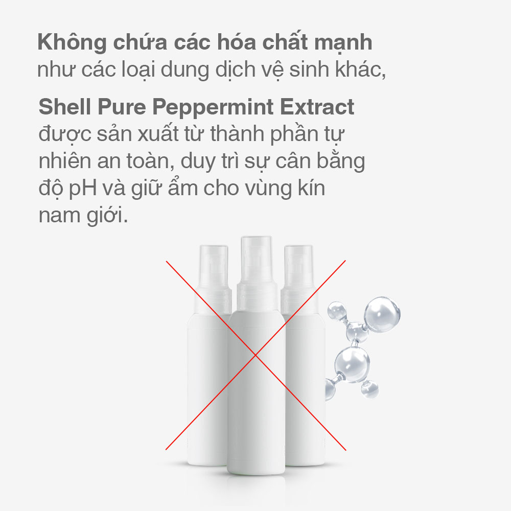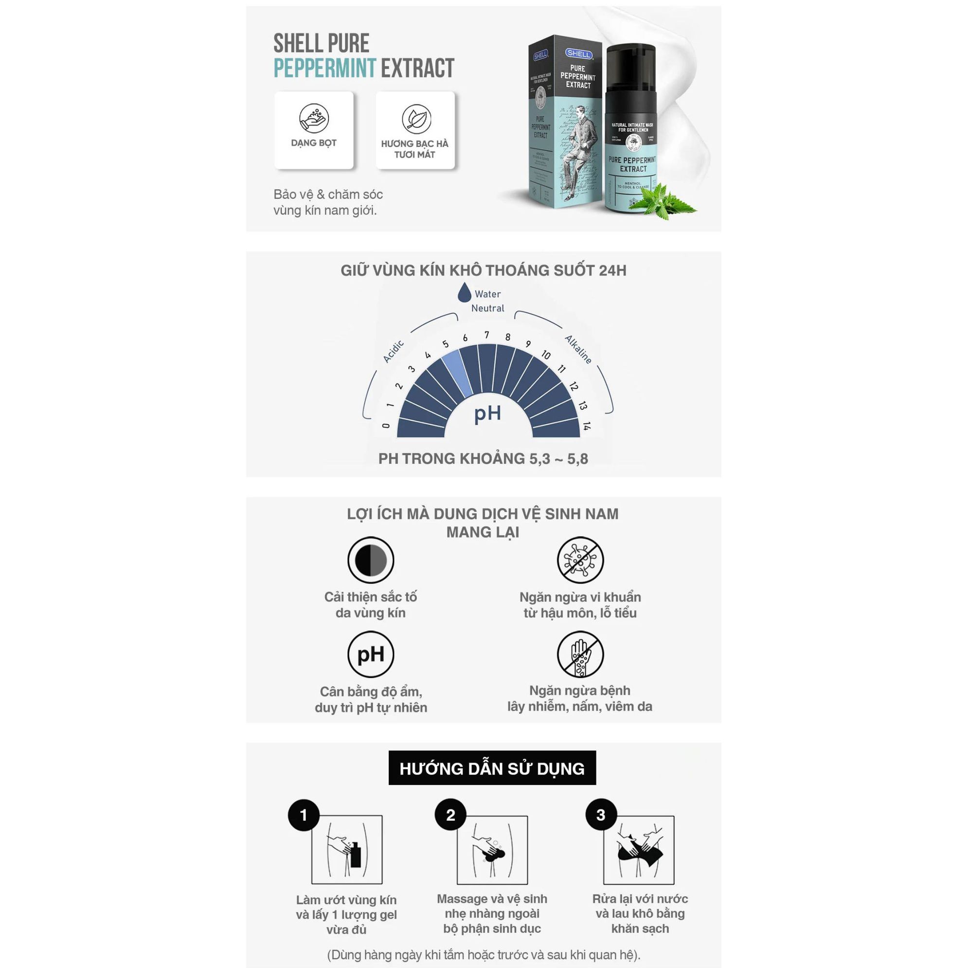 Giới thiệu: Dung dịch vệ sinh nam dạng bọt, hương bạc hà tươi mát - Shell Pure Peppermint Extract đem đến giải pháp chăm sóc sức khỏe tiện lợi, an toàn cho vùng kín nam giới. Nhờ thế, các chàng luôn tự tin, giữ vững bản lĩnh và phong độ trước mặt bạn tình. Thành phần: Nước, Sodium Laureth Sulfate, cocɑmidopropyl, Sodium Lactate, Sodium Gluconate, Piper Betle (leaf) Extract, Propylene Glycol, Panthenol: Vitamin B5, DMDM Hydantoin, Menthol, Tocopheryl Acetate, Olive Oil PEG-7 Esters, Mentha Piperita (Peppermint) Oil, Alpha terpineol, Vitamin E. Đặc điểm: Sản phẩm đem đến hiệu quả cao trong việc vệ sinh cơ quan sinh dục ngoài, ngăn mùi và khử mùi nhiều giờ liền. Cảm giác sau khi sử dụng là sự thoải mái, sạch sẽ và tự tin. Dung dịch có dạng bọt, có khả năng kháng khuẩn, ngăn ngừa các loại vi khuẩn và nấm gây bệnh. Khi dùng đều đặn, da vùng kín sẽ được cải thiện sắc tố, tăng độ đàn hồi và mềm mịn. Hương thơm bạc hà kết hợp cùng sự mát lạnh đem đến cảm giác sảng khoái. Sản phẩm tuyệt đối an toàn để lựa chọn sử dụng mỗi ngày. Cách dùng: Lấy một lượng ɡel vừa đủ ra lòng bàn tay, làm ướt và vệ sinh nhẹ nhàng bộ phận sinh dục. Sau đó, hãy rửa sạch lại với nước và thấm khô bằng khăn sạch. Lưu ý: Sản phẩm chỉ được khuyến nghị sử dụng để vệ sinh ngoài. Quy cách: Chai 100ml Thương hiệu: Shell Bảo quản: Những nơi khô ráo, thoáng mát Hạn sử dụng: 03 năm