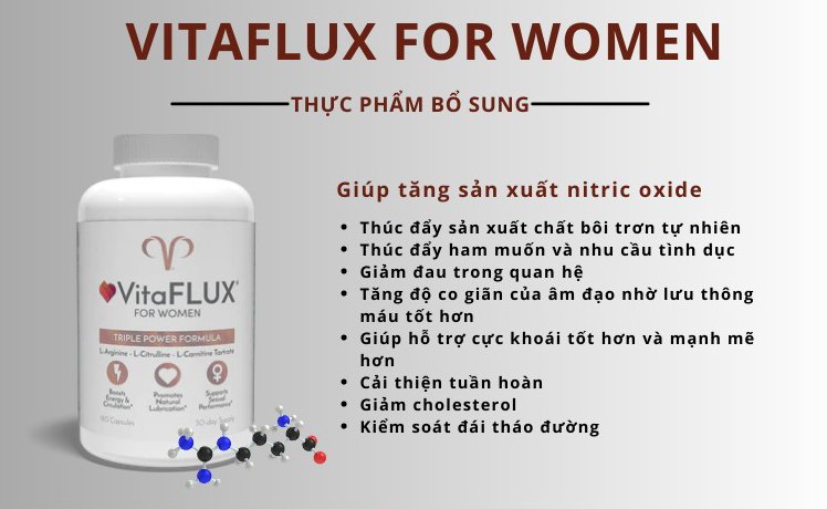 Chi Tiết Về Thực Phẩm Tăng Cường Sinh Lý Nữ Promescent VitaFLUX For Women: - Chủng loại: Viên uống hỗ trợ tăng cường sinh lý nữ. - Thành phần: L-Arginine 2000mg, L-Citrulline 1000mg, L-Carnitine Tartrate 1000mg, Kẽm 10,5mg, Magie 64mg. - Quy cách: lọ 180 viên, sử dụng trong 30 ngày. - Thương hiệu: Promescent - Sản xuất và đóng hộp tại Mỹ.